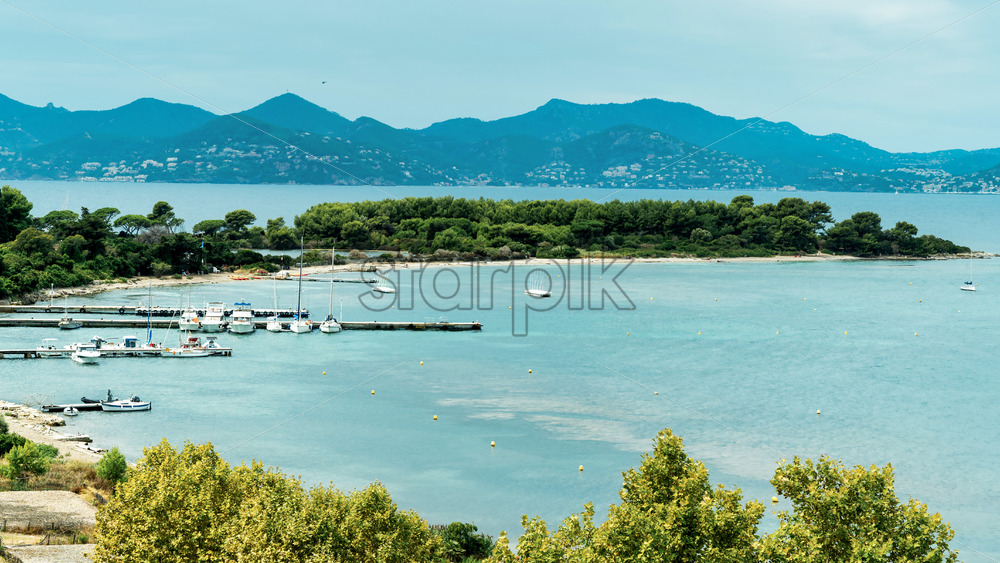 View of the Mediterranean sea coast on the Island of Sainte-Marguerite, Cannes on the background, France