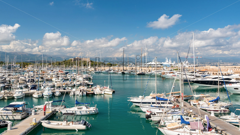 View of the sea port in antibes, France. Moored boats and yachts, Fort Carre on the background, greenery