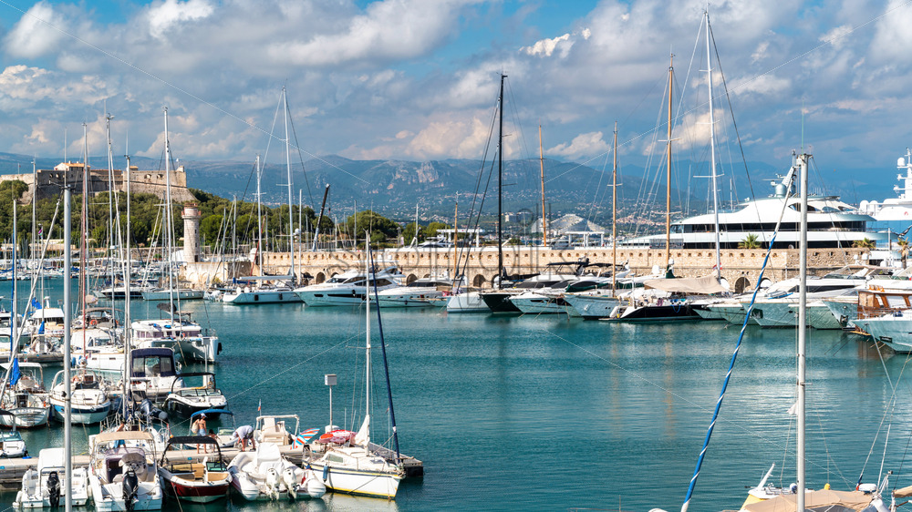 View of the sea port in antibes, France. Moored boats and yachts, Fort Carre on the background, greenery