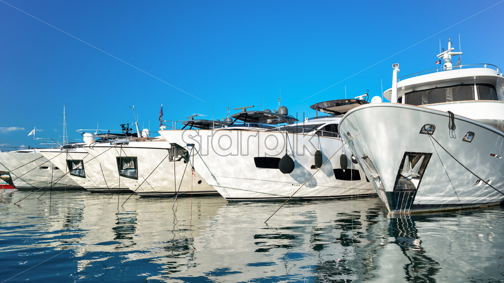View of the sea port of Antibes, France. Moored yachts, blue water of the Mediterranean sea
