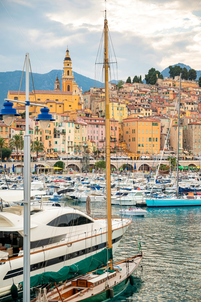 View of the sea port in Menton, France. Moored boats and yachts, Basilica St. Michel on the background, multiple buildings