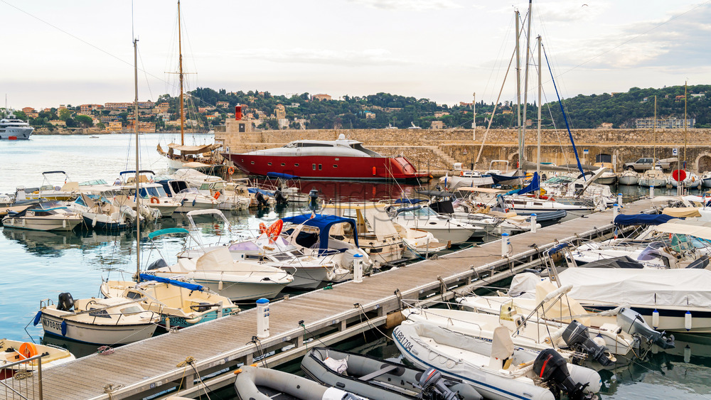 View of the sea port in Menton, France. Moored yachts, town on the background