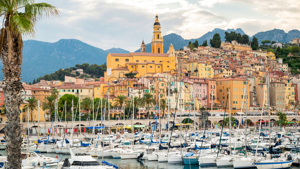View of the sea port in Menton, France. Moored boats and yachts, Basilica St. Michel on the background, multiple buildings