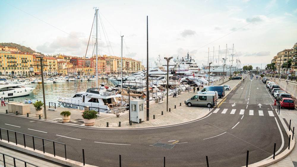 View of the sea port in Nice, France. Moored boats and yachts, embankment street on the foreground, traditional buildings