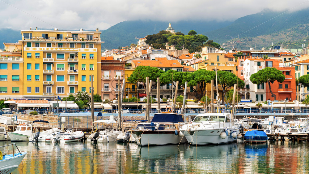 Home » Shop » photo » View of the sea port in Nice, France. Multiple moored boats and yachts, buildings and greenery