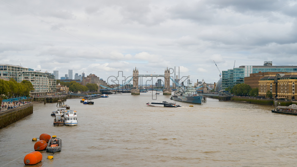View of the Thames river in London downtown, United Kingdom. Tower Bridge in the distance, moored HMS Belfast museum ship and other moored and floating boats