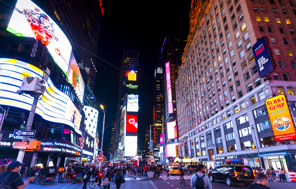 NEW YORK, USA – SEPTEMBER, 2019: View of the Times Square at night. A lot of illumination, advertisement on skyscrapers facades, multiple people