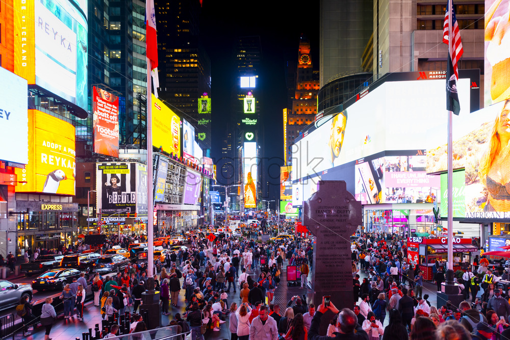 NEW YORK, USA – SEPTEMBER, 2019: View of the Times Square at night. Monument, a lot of illumination, advertisement on skyscrapers facades, multiple people
