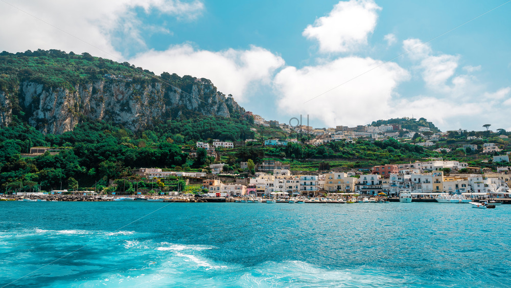 View of the Tyrrhenian sea coast in Capri, Italy. Classic buildings, piers with moored boats, greenery. View from a ship