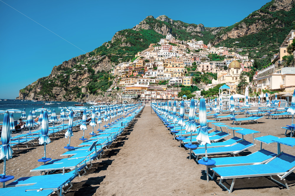 View of the Tyrrhenian sea coast in Positano, Italy. Beach with people and sunbeds, residential buildings in the distance