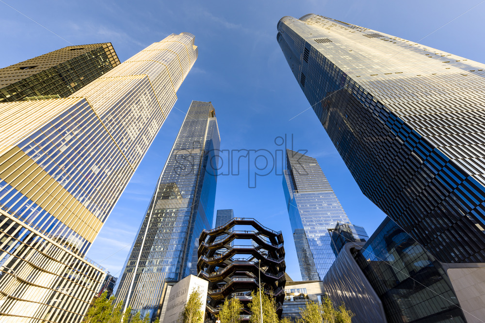 View of the Vessel in New York downtown, USA. Structure and visitor attraction with skyscrapers around it and visitors