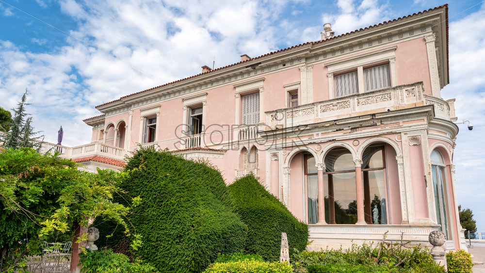 View of the Villa Ephrussi de Rothschild with garden full of greenery in Saint-Jean-Cap-Ferrat, France
