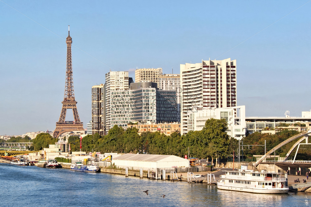 View on Paris city, France. Eiffel statue, seine river, Marechaux Boulevard
