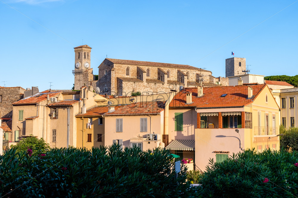 View to an ancient clock tower of a church in Cannes. Houses nearby. Old French architecture. Populated zone Royalty Free Stock photo