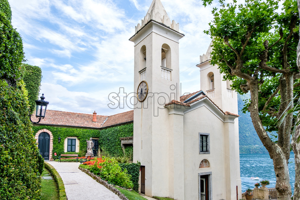 Villa del Balbianello green garden with chapel. Clouds on background. Lenno, Italy Royalty Free Stock photo