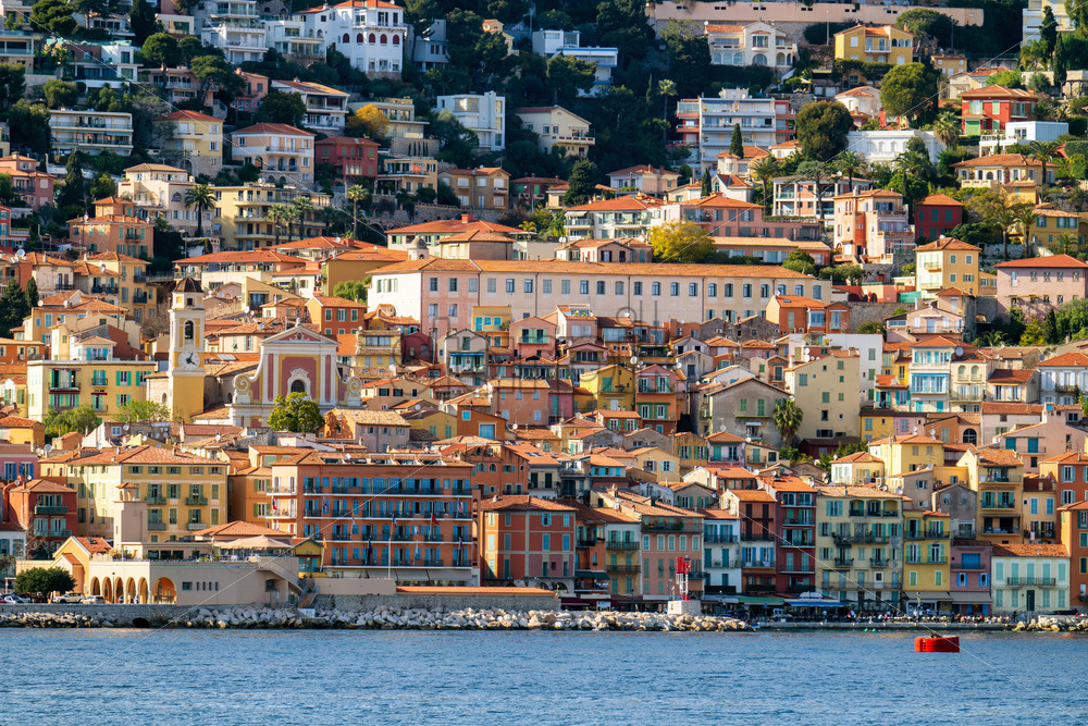 Beautiful daylight view from top of mountains to luxury resort villefranche sur mer and bay on french riviera at mediterranean sea Cote d’Azur in France, beach with boats cruising on water.