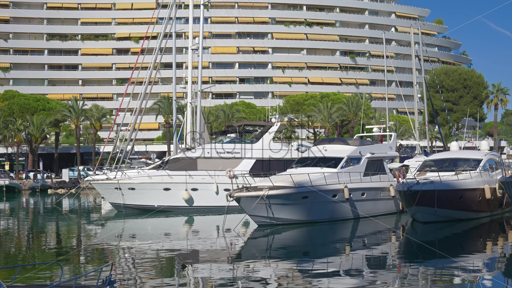 Boats docked in the Marina Baie des Anges in Villeneuve-Loubet, France in daylight Royalty Free Stock Video Footage
