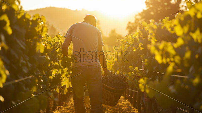 A hardworking farmworker in the sunlit vineyards of Napa Valley, California, as he harvests grapes