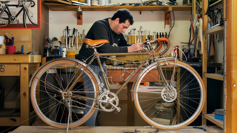 An enthusiast restoring a vintage bicycle in a workshop, surrounded by tools, spare parts, and a passion for preserving cycling history.