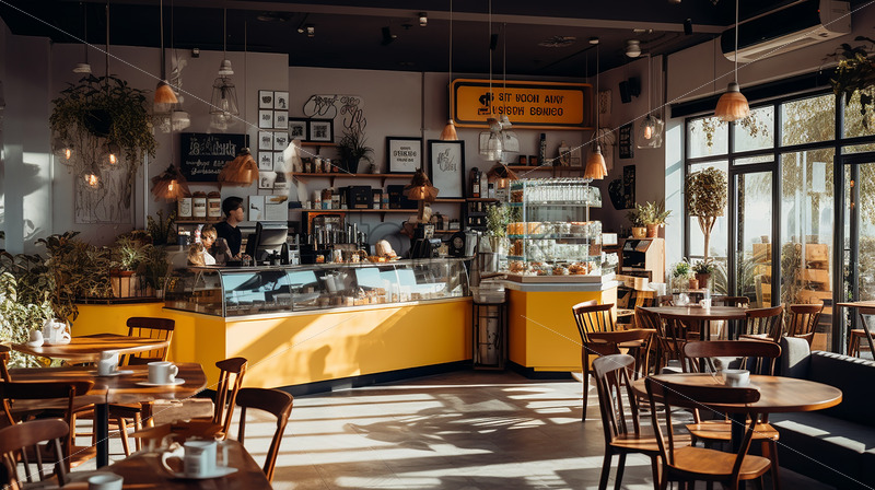 Vintage Cafe architecture in the city in a yellow aand wood theme classy counter with hanging and indoor plants classy theme