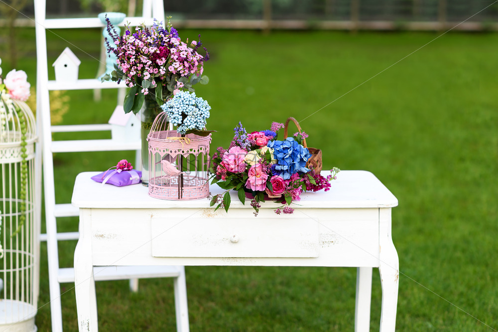 Vintage wedding decoration with white table, flowers and parrot cage.
