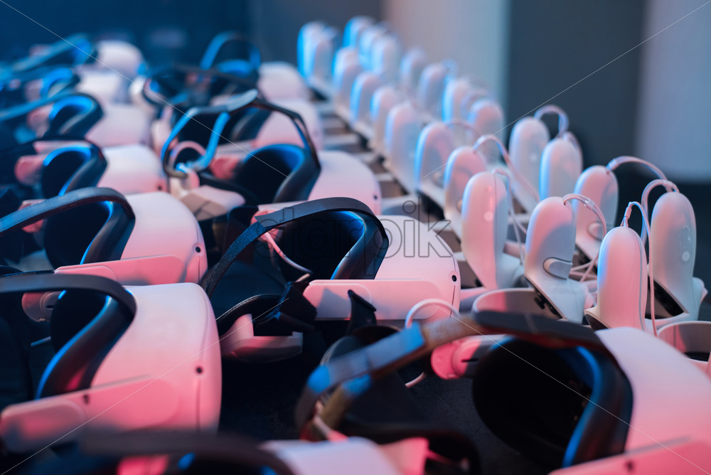 First person view of using virtual reality VR equipment on an arena. Team of young friends playing virtual games. Neon lights Royalty Free Stock Video Footage