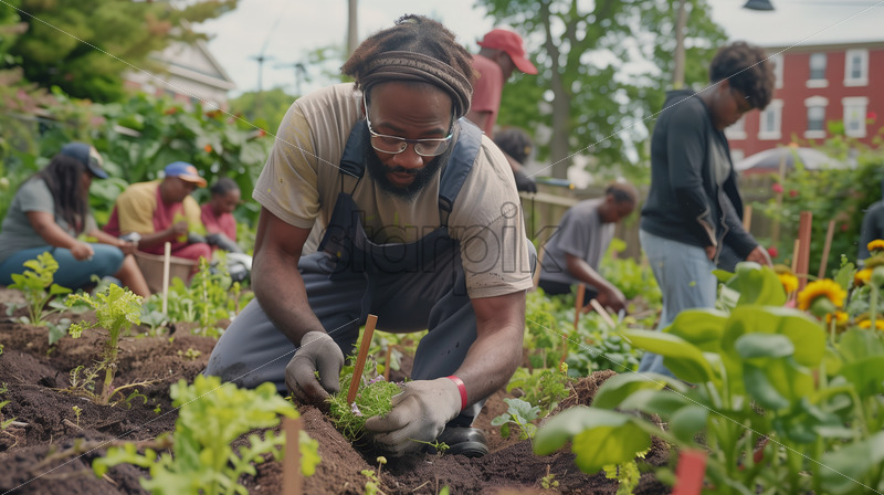 A diverse group of volunteers works together in a community garden, planting vegetables and flowers with care and teamwork. Their faces are radiant with pride and fulfillment as they nurture their shared green space.