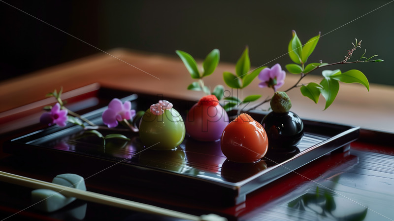 Colorful wagashi sweets on a traditional Japanese lacquerware tray, complemented by a sprig of seasonal foliage.