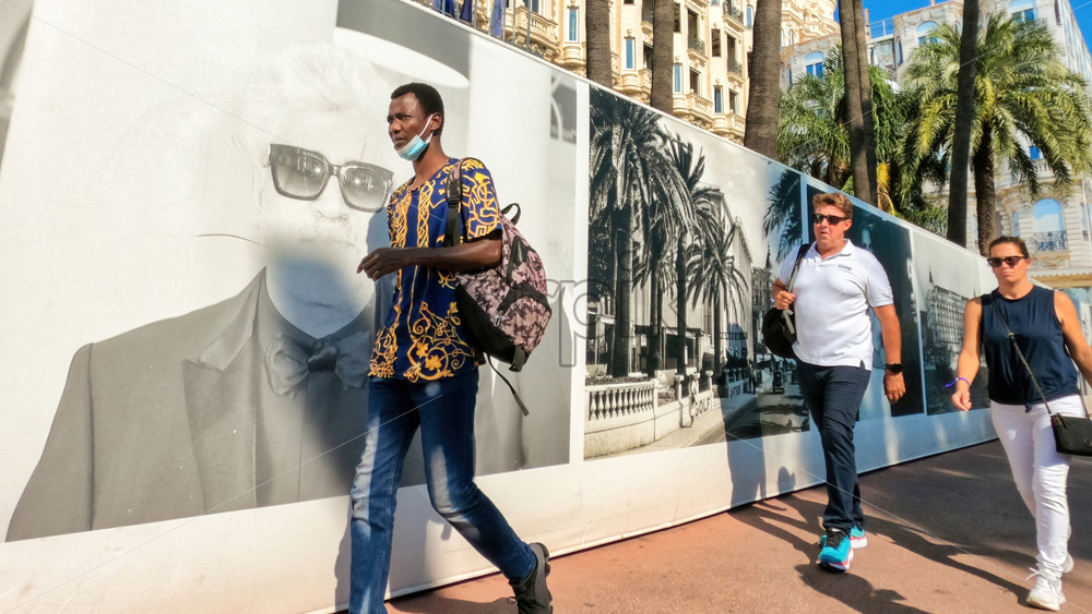 CANNES, FRANCE – SEPTEMBER 12, 2021: Walking people on a sidewalk
