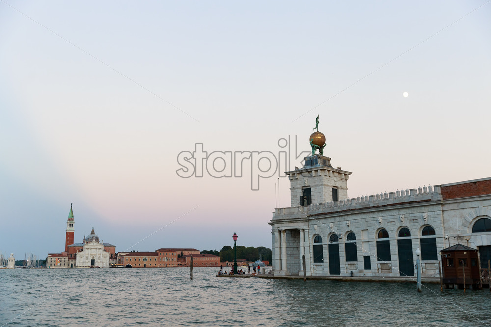 Aerial drone view of Venice, Italy. Water channels with multiple floating and moored boats, historical city centre with Santa Maria della Salute and other old buildings and narrow streets