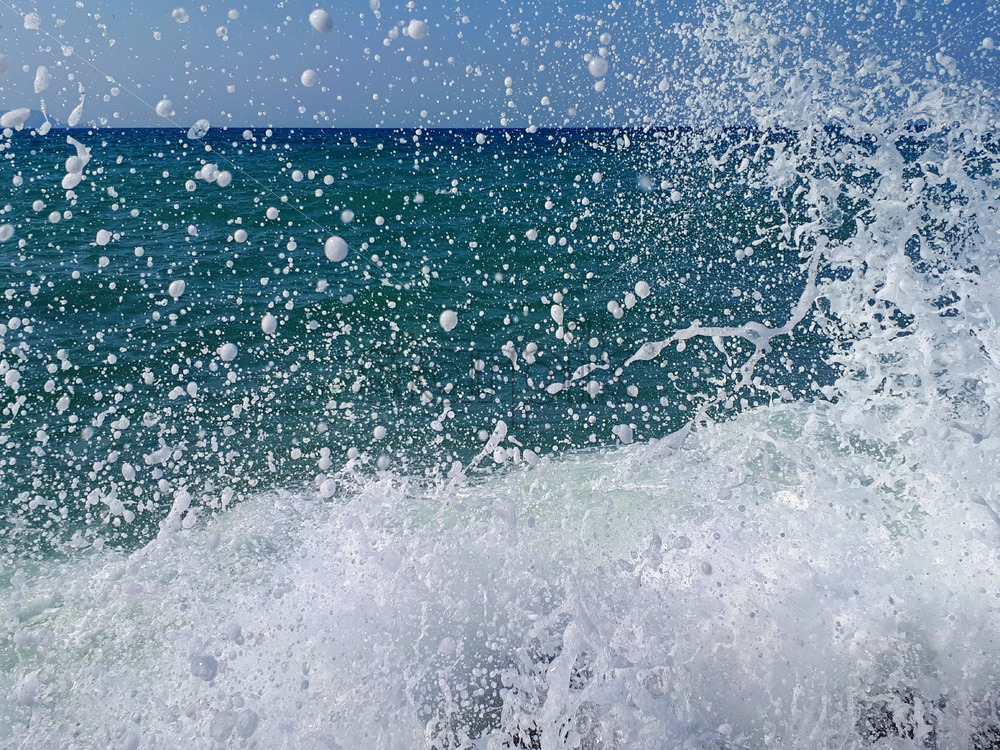Water splashes at sea and beach with blue sky in heraklion, crete island, greece Royalty Free Stock photo