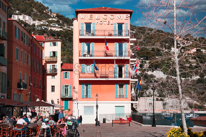 Villefranche sur Mer, France – March 8, 2024: Welcome Hotel. Seaside town on the French Riviera