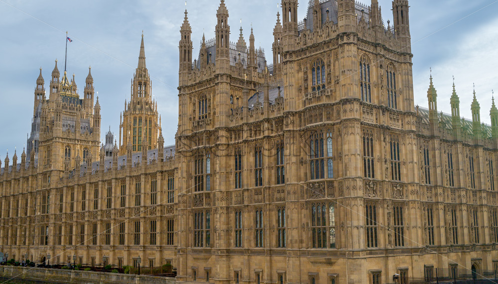 LONDON, UNITED KINGDOM – SEPTEMBER 11, 2023: View of the Westminster Palace, Bridge with people and buses and the Elizabeth Tower in city downtown. Thames river