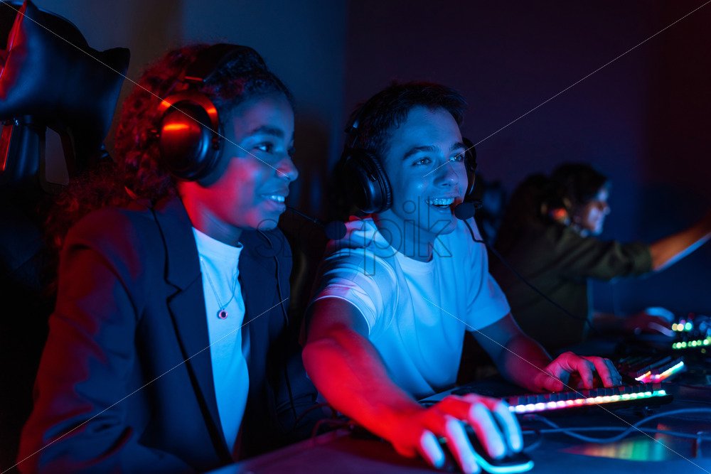 White boy and black girl teens in headsets playing video games in game club with blue and red illumination. Keyboard and mouse with illumination