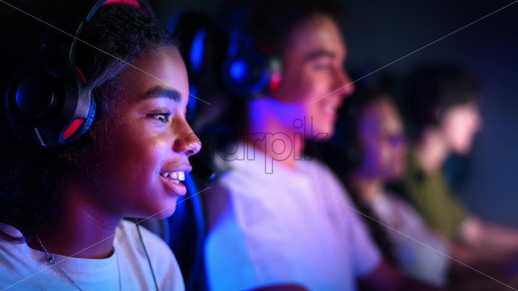 White boy and black girl teens in headsets playing video games in video game club with blue and red illumination. Keyboard with illumination