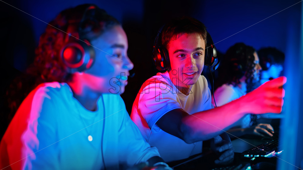 White boy and black girl teens in headsets talking and playing video games in video game club with blue and red illumination