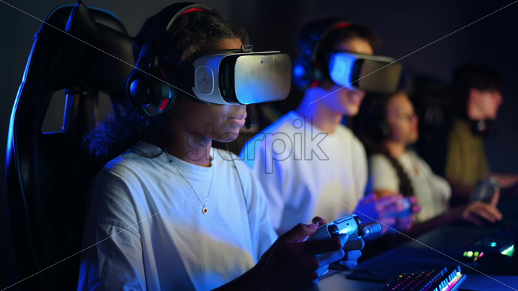 White boy and black girl teens in VR headsets playing video games in video game club with blue illumination using a gamepad, virtual reality Royalty Free Stock Video Footage