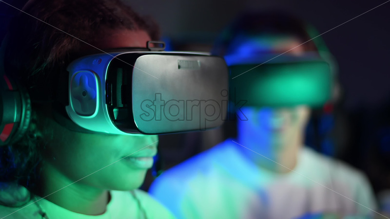 Premium stock video footage – White boy and black girl teens in headsets playing video games in video game club with blue and red illumination. Slow motion Royalty Free Stock Video Footage