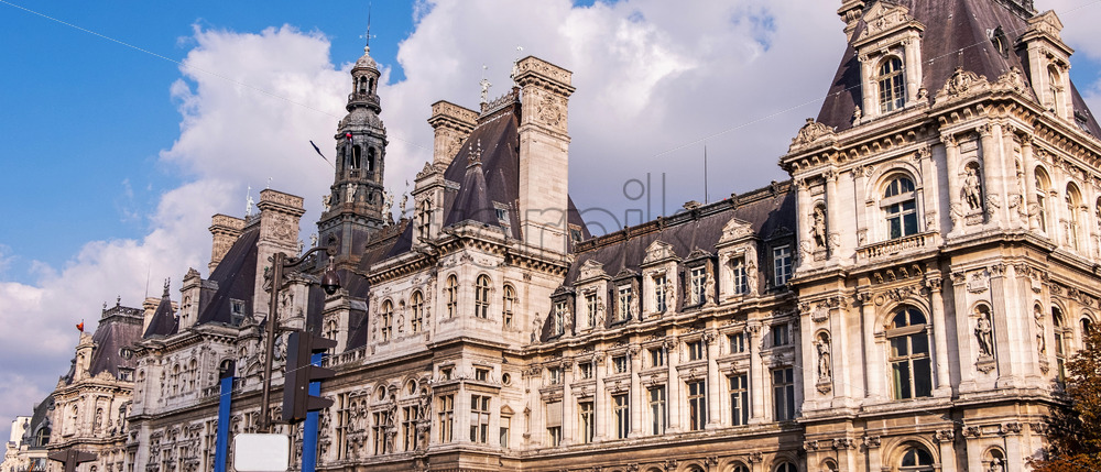 Wide panorama of Hotel de Ville in Paris. Shot during the day with some soft clouds covering the sun making a dramatic effect with a slight magenta look Royalty Free Stock photo