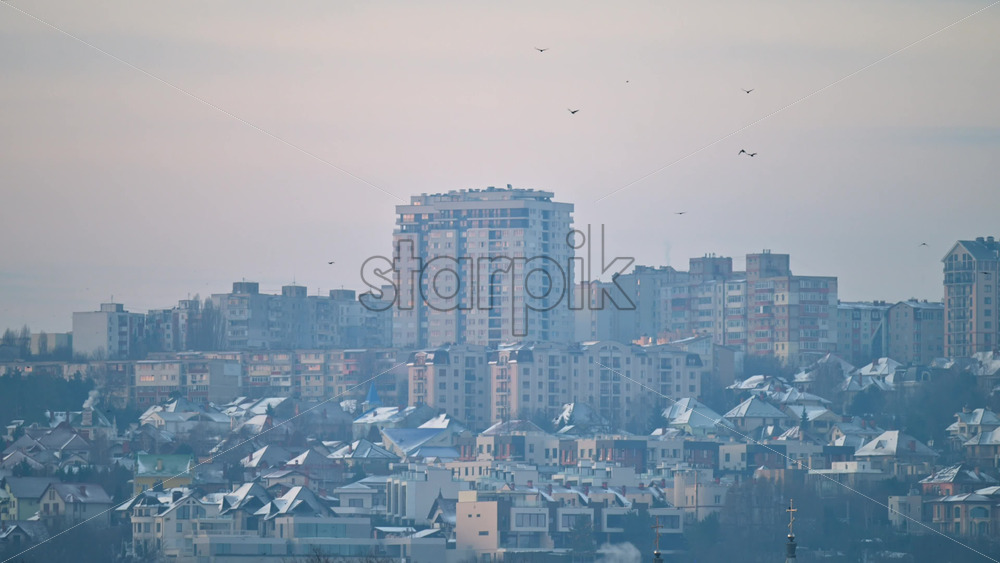 Wide residential cityscape with layered apartment buildings and houses under soft morning haze