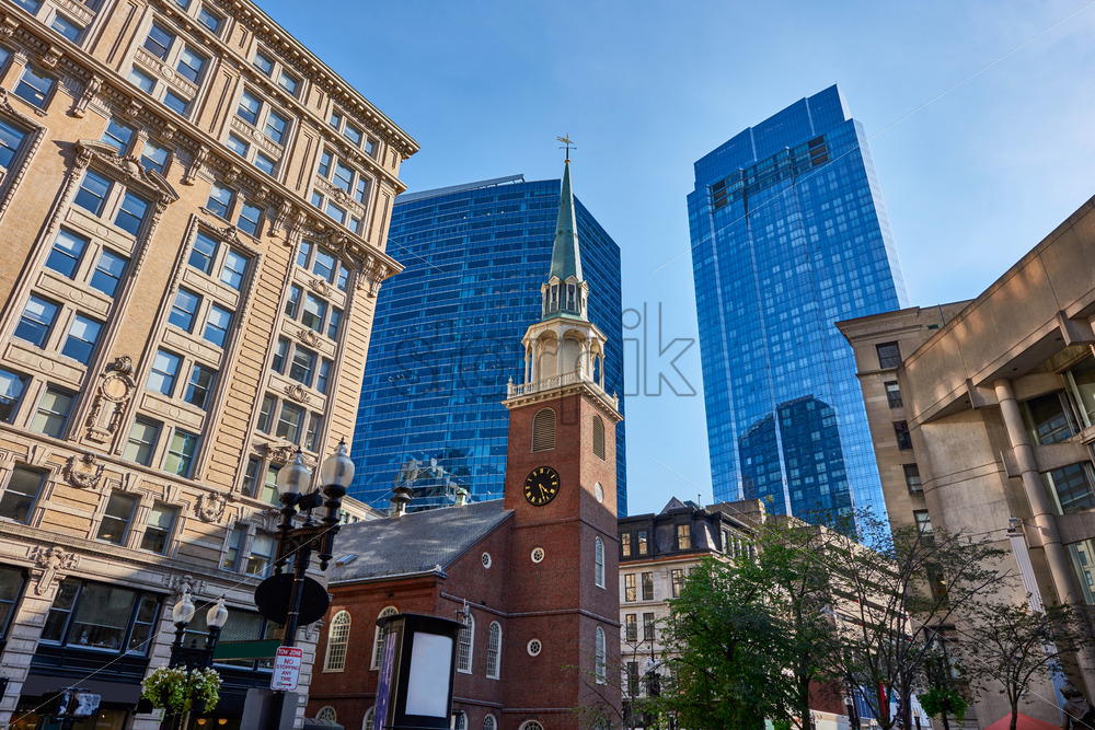 Wide shot of Old South Meeting House with two high commercial building made of glass. The weather is calm and sunny Royalty Free Stock photo