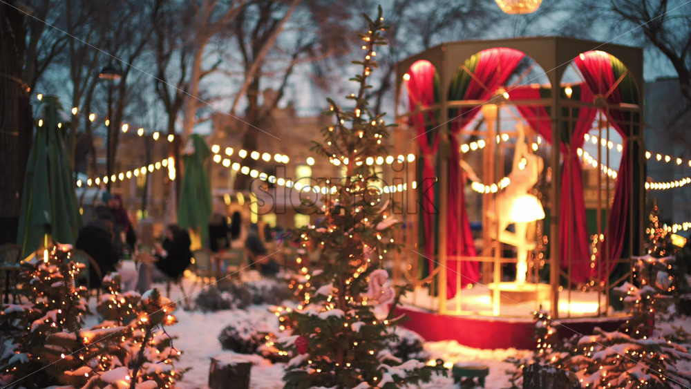 Home » Shop » 1 Video » Wide view of a festive Christmas decoration with lights, at an outdoor cafe near small trees, and ornaments