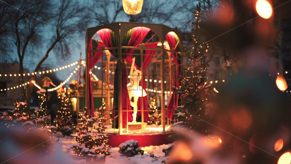 Home » Shop » 1 Video » Wide view of a festive Christmas decoration with lights, at an outdoor cafe near small trees, and ornaments