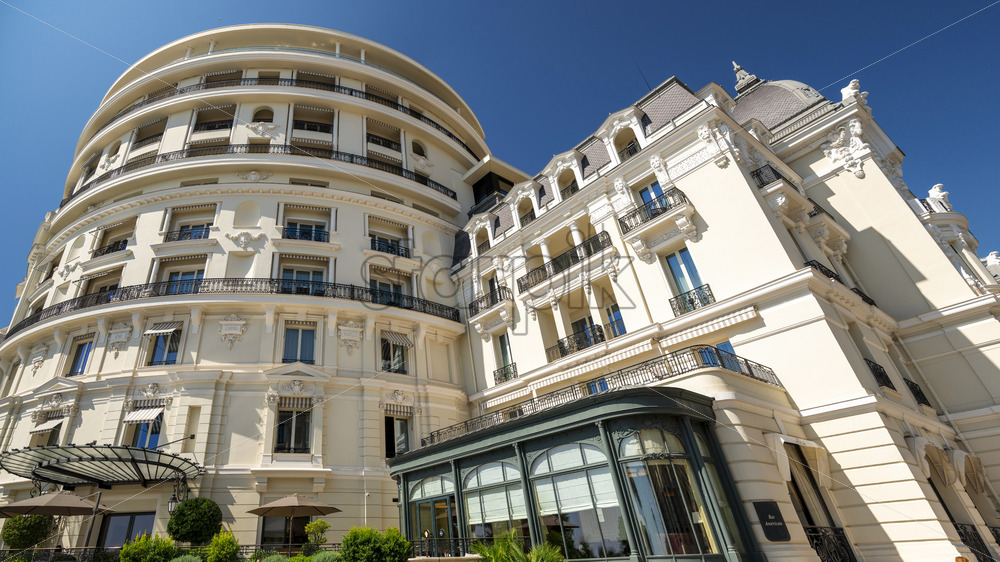 Daylight portrait view from top to city buildings and green mountains on background. Historical architecture. Parked cars on streets. Negative copy space, place for text. Monte Carlo, Monaco