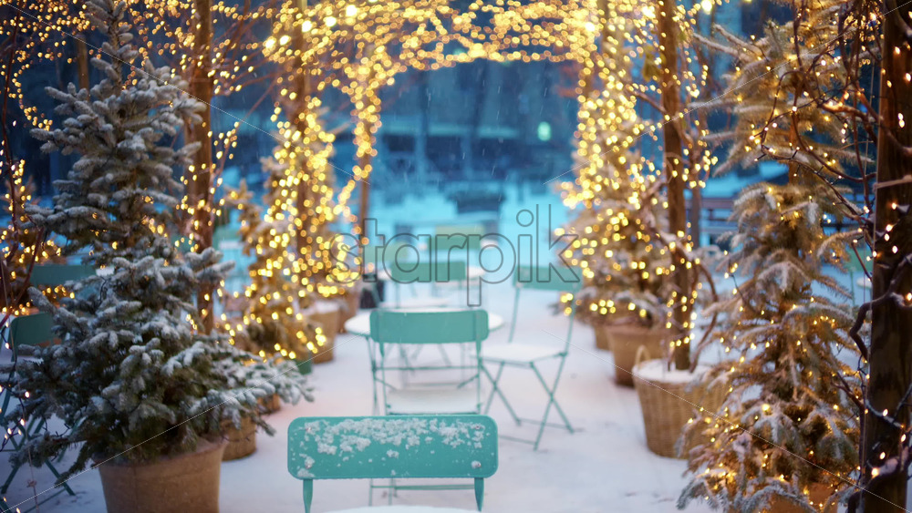 Charming outdoor cafe decorated with Christmas lights, plants, and winter decorations
