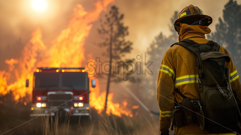 A brave firefighter in a wildfire setting, standing near a specialized firefighting vehicle, with flames and smoke in the background.