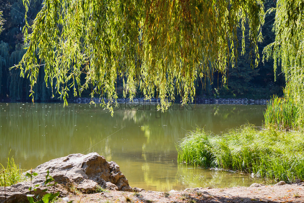 Willow trees at the lake with reflection, central park in Edinet city, north of republic of Moldova