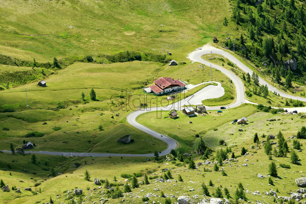 Magical dolomites mountains with white sunlight in Italy, green forest