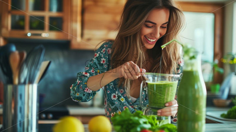 Woman holding fresh spinach green smoothie with lemon decoration and bamboo straw. Red knitted sweater. Healthy products. Royalty Free Stock photo
