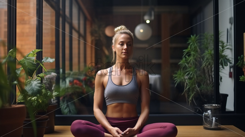 A woman leads a morning yoga session with others, hands raised above their heads, as the rising sun filters through tree branches, captured from the front with blurred colleagues in the background.